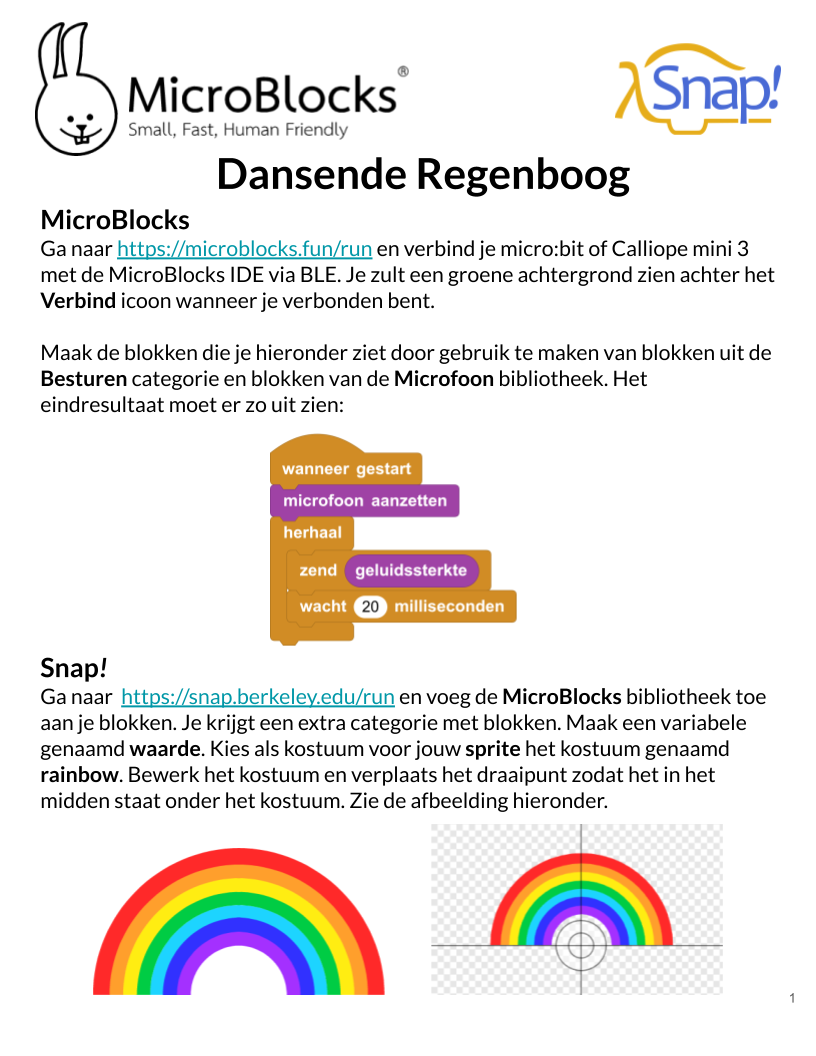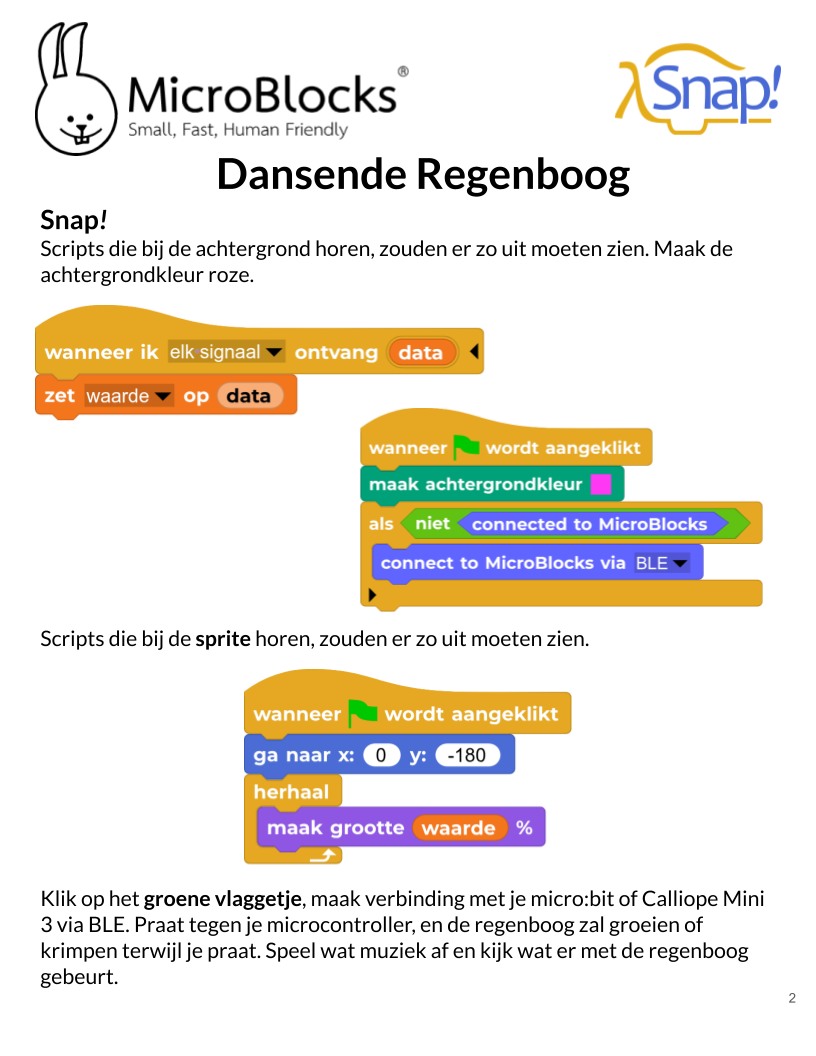 Gebruik Snap! en MicroBlocks om een Dansende Regenboog te maken die reageert op het volume van je stem door gebruik te maken van de microfoon van je micro:bit of Calliope mini 3.