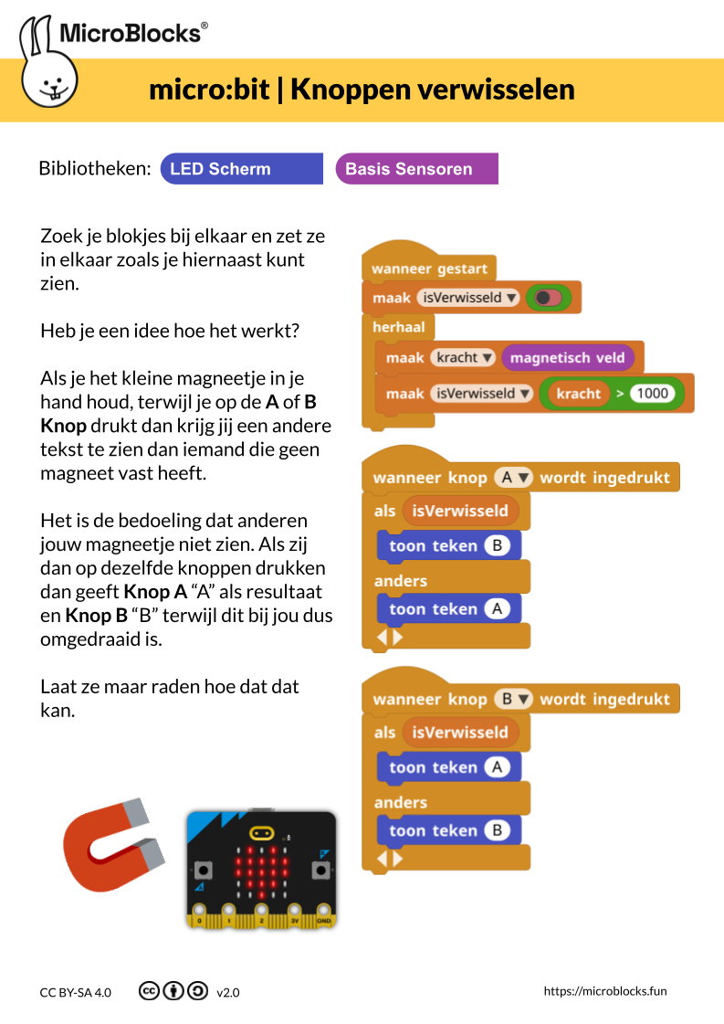 Als je op de knop hieronder drukt dan wordt de programmacode geopend in de online versie van MicroBlocks.