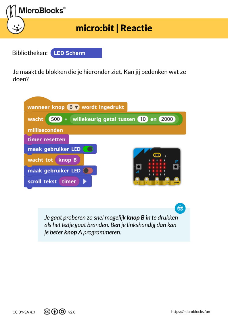Als je op de knop hieronder drukt dan wordt de programmacode geopend in de online versie van MicroBlocks.